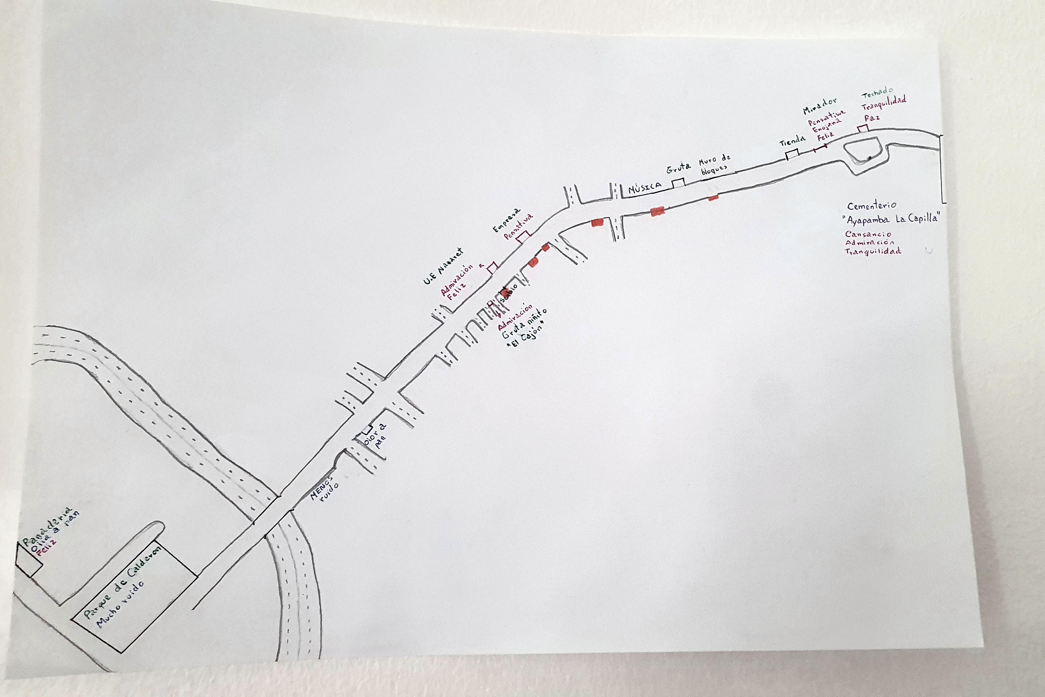 Mapping the UrbanThe workshop Mapping the City aims to introduce walking and mapping as qualitative research tools for studying the urban environment. The workshop consisted of three sessions held over three days and was designed for students of urban anthropology. Grounded in selected readings and an in-class presentation, the workshop emphasized sensory and emotional experience as a means of investigating and understanding urban space. Discussions explored how mapping and exploration can contribute to understanding the lived landscape and the everyday rhythms of the city. The workshop also examined the map as a representational object and presented contemporary and interdisciplinary mapping practices. Students had the opportunity to explore and use these tools through a short mapping exercise completed in class, followed by a half-day field excursion.The field excursion involved walking from the center of a densely populated neighborhood in Quito, called Calderón, to a nearby commune known as La Capilla. Communes are legally recognized by the 2008 Constitution of the Republic of Ecuador as collective property of ancestral territories, although not all current communes are formally categorized as ancestral. Once in La Capilla, we were guided through the area by a local resident. Students were encouraged to gather sufficient sensory and social information to produce a map of this walk.In the final session, students brought their maps to class and presented them to the group. The class discussion focused on what kind of information the walk provided: how did the urban landscape shift along the way? Can the commune be understood as a rural/urban hybrid space? Which characteristics and challenges typical of Latin American cities became apparent? The group also reflected on the mapping exercise itself—its advantages and limitations—and considered how it can be used as a research tool in urban ethnography.